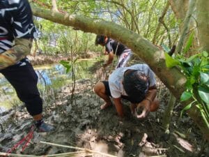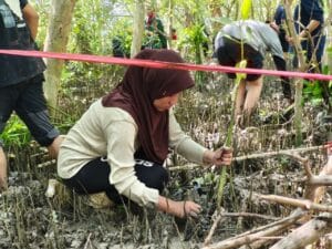 Sesampainya di lokasi, acara berlanjut dengan penanaman mangrove. Para peserta bergotong royong menanam bibit mangrove di area rehabilitasi pantai. Kegiatan ini menjadi momen paling berkesan, di mana setiap pesepeda secara langsung berkontribusi menjaga ekosistem pesisir, mencegah abrasi, melindungi habitat biota laut, serta membantu penyerapan karbon.